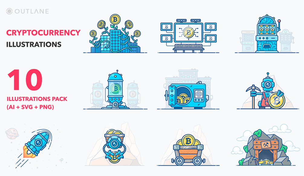 The pack includes 10 unique illustrations: Bitcoin City, Control Room, Slot Machine, Incubator, Safe, Miner, Fast Delivery Rocket, Convey Guy, Mine Cart, Mine.