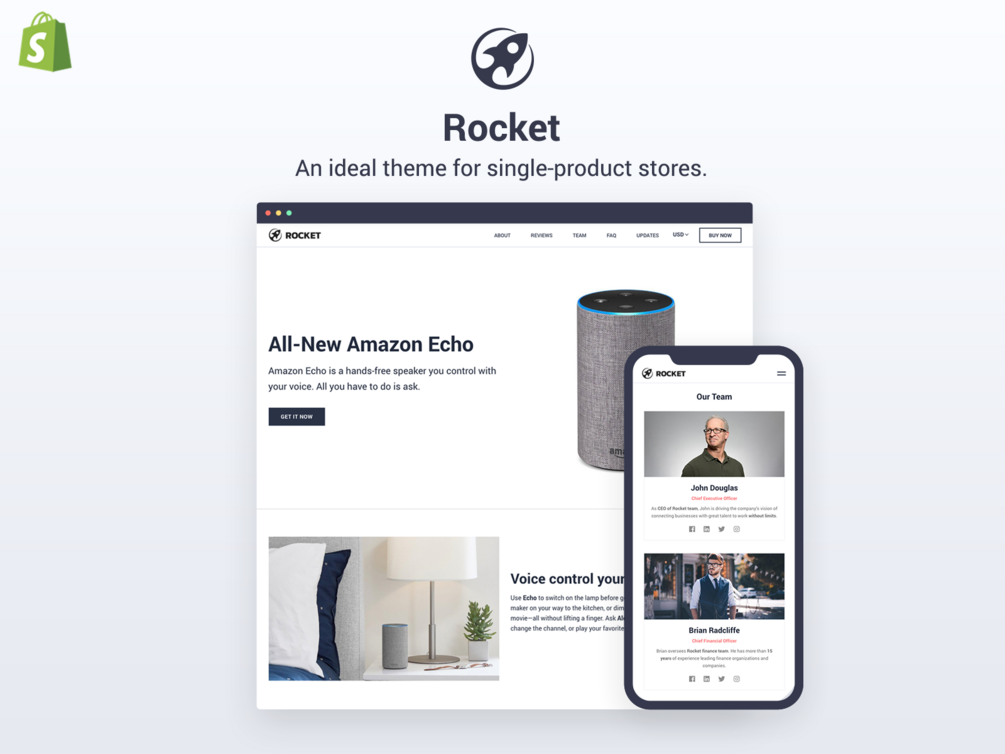 Rocket theme for Shopify is an ideal solution for single-product stores. It has a large number of fully customisable responsive theme sections that allow you to quickly test different marketing techniques to get the best conversion rate. The theme is precisely designed for small-catalog stores, at the same time it has all the essentials for you to sell as many products as you need.